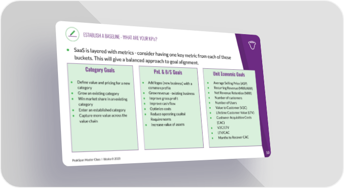ESTABLISH A BASELINE - WHAT ARE YOUR KPIs? ● SaaS is layered with metrics - consider having one key metric from each of these buckets. This will give a balanced approach to goal alignment. Category Goals PnL & B/S Goals Unit Economic Goals ● Average Selling Price (ASP) ● Add logos (new business) with a ● Define value and pricing for a new ● Recurring Revenue (MRR/ARR) common profile category ● Net Revenue Retention (NRR) ● Grow revenue - existing business ● Grow an existing category ● Number of customers ● Improve gross profit ● Win market share in an existing ● Number of Users ● Improve cash flow category ● Value to Customer (V2C) ● Optimize costs ● Enter an established category ● Lifetime Customer Value (LTV) ● Reduce operating capital ● Capture more value across the ● Customer Acquisition Costs Requirements value chain (CAC) ● Increase value of assets ● V2C/LTV ● LTV/CAC ● Months to Recover CAC PeakSpan Master Class I Ibbaka © 2023 10
