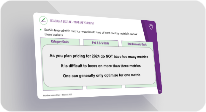 ESTABLISH A BASELINE - WHAT ARE YOUR KPIs? ● SaaS is layered with metrics - you should have at least one key metric in each of these buckets Category Goals PnL & B/S Goals Unit Economic Goals ● Average Selling Price (ASP) ● Add logos (new business) with a ● Define value and pricing for a new ● Recurring Revenue (MRR/ARR) common profile category ● Net Revenue Retention (NRR) ● Grow revenue - existing business ● Grow an existing category As you plan pricing for 2024 do NOT have too many metrics ● Number of customers ● Improve gross profit ● Win market share in an existing ● Number of Users ● Improve cash flow category ● Value to Customer (V2C) ● Optimize costs ● Enter an established category It is difficult to focus on more than three metrics ● Lifetime Customer Value (LTV) ● Reduce operating capital ● Capture more value across the ● Customer Acquisition Costs Requirements value chain (CAC) ● Increase value of assets One can generally only optimize for one metric ● V2C/LTV ● LTV/CAC ● Months to Recover CAC PeakSpan Master Class I Ibbaka © 2023 11