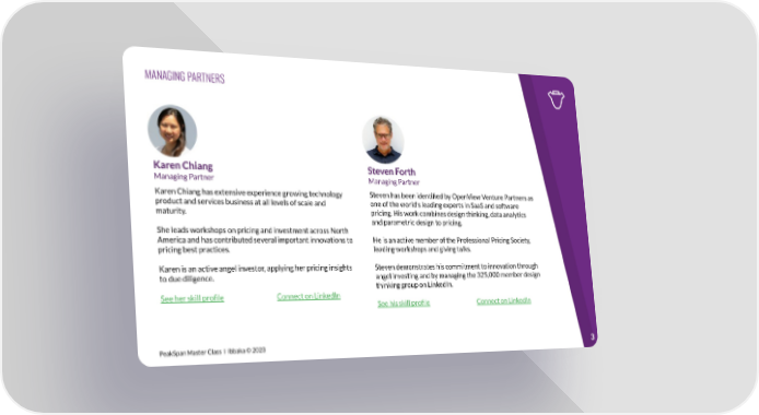 MANAGING PARTNERS Karen Chiang Steven Forth Managing Partner Managing Partner Karen Chiang has extensive experience growing technology Steven has been identified by OpenView Venture Partners as product and services business at all levels of scale and one of the world’s leading experts in SaaS and software maturity. pricing. His work combines design thinking, data analytics and parametric design to pricing. She leads workshops on pricing and investment across North America and has contributed several important innovations to He is an active member of the Professional Pricing Society, pricing best practices. leading workshops and giving talks. Karen is an active angel investor, applying her pricing insights Steven demonstrates his commitment to innovation through to due diligence. angel investing and by managing the 325,000 member design thinking group on LinkedIn. See her skill profile Connect on LinkedIn See his skill profile Connect on LinkedIn PeakSpan Master Class I Ibbaka © 2023 3