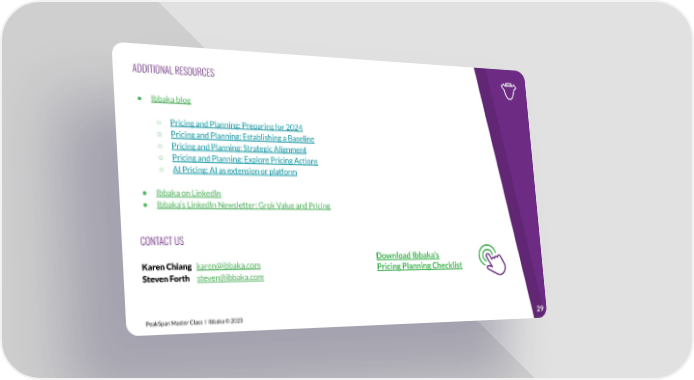 ADDITIONAL RESOURCES ● Ibbaka blog ○ Pricing and Planning: Preparing for 2024 ○ Pricing and Planning: Establishing a Baseline ○ Pricing and Planning: Strategic Alignment ○ Pricing and Planning: Explore Pricing Actions ○ AI Pricing: AI as extension or platform ● Ibbaka on LinkedIn ● Ibbaka’s LinkedIn Newsletter: Grok Value and Pricing CONTACT US Download Ibbaka's Karen Chiang [email protected] Pricing Planning Checklist Steven Forth [email protected] PeakSpan Master Class I Ibbaka © 2023 29