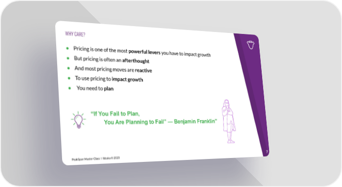 WHY CARE? ● Pricing is one of the most powerful levers you have to impact growth ● But pricing is often an afterthought ● And most pricing moves are reactive ● To use pricing to impact growth ● You need to plan “If You Fail to Plan, You Are Planning to Fail” — Benjamin Franklin” PeakSpan Master Class I Ibbaka © 2023 7