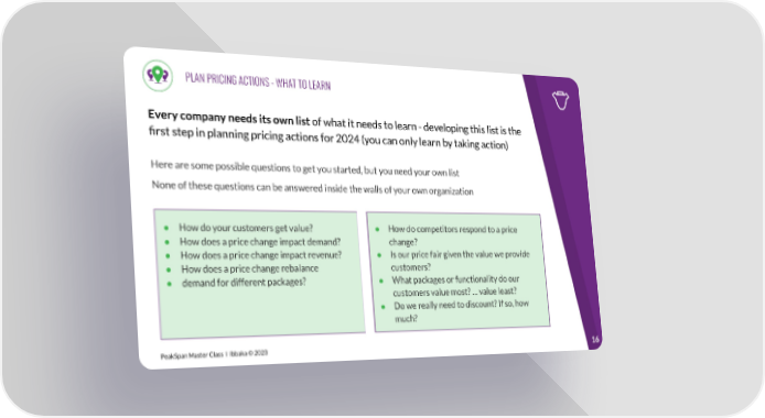 PLAN PRICING ACTIONS - WHAT TO LEARN Every company needs its own list of what it needs to learn - developing this list is the first step in planning pricing actions for 2024 (you can only learn by taking action) Here are some possible questions to get you started, but you need your own list None of these questions can be answered inside the walls of your own organization ● How do your customers get value? ● How do competitors respond to a price ● How does a price change impact demand? change? ● How does a price change impact revenue? ● Is our price fair given the value we provide ● How does a price change rebalance customers? ● demand for different packages? ● What packages or functionality do our customers value most? … value least? ● Do we really need to discount? If so, how much? PeakSpan Master Class I Ibbaka © 2023 16