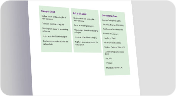 CHOOSE WHICH GOALS MATTER 19 SaaS is layered with metrics - consider having one key metric from each of these buckets. This will give a balanced approach to goal alignment. Category Goals PnL & B/S Goals Unit Economic Goals De昀椀ne value and pricing for a De昀椀ne value and pricing for a Average Selling Price (ASP) new category new category Recurring Revenue (MRR/ARR) Grow an exis琀椀ng category Grow an exis琀椀ng category Net Revenue Reten琀椀on (NRR) Win market share in an exis琀椀ng Win market share in an exis琀椀ng category category Number of customers Enter an established category Enter an established category Number of Users Capture more value across the Capture more value across the Value to Customer (V2C) value chain value chain Life琀椀me Customer Value (LTV) Customer Acquisi琀椀on Costs (CAC) V2C/LTV LTV/CAC Months to Recover CAC Ibbaka’s Pricing Planning Guide & Checklist for 2024 November 2023