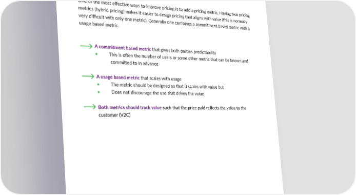 PRICING ACTIONS TO CONSIDER 24 ADD A PRICING METRIC One of the most e昀昀ec琀椀ve ways to improve pricing is to add a pricing metric. Having two pricing metrics (hybrid pricing) makes it easier to design pricing that aligns with value (this is normally very di昀케cult with only one metric). Generally one combines a commitment based metric with a usage based metric. A commitment based metric that gives both par琀椀es predictability • This is o昀琀en the number of users or some other metric that can be known and commi琀琀ed to in advance A usage based metric that scales with usage • The metric should be designed so that it scales with value but • Does not discourage the use that drives the value Both metrics should track value such that the price paid re昀氀ects the value to the customer (V2C) Ibbaka’s Pricing Planning Guide & Checklist for 2024 November 2023