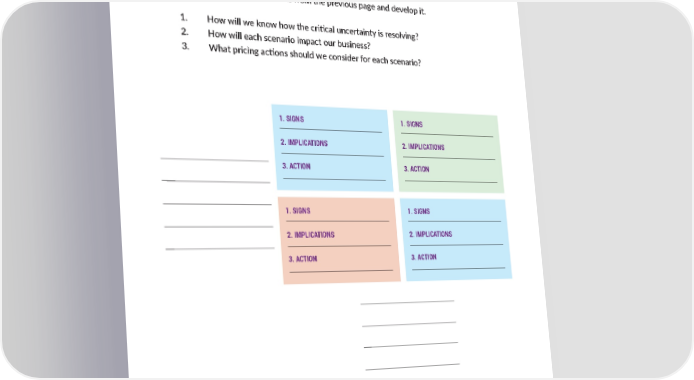 11 DEVELOP A PRICING POSSIBILITIES SCENARIO Choose one of the three possibili琀椀es from the previous page and develop it. 1. How will we know how the cri琀椀cal uncertainty is resolving? 2. How will each scenario impact our business? 3. What pricing ac琀椀ons should we consider for each scenario? 1. SIGNS 1. SIGNS 2. IMPLICATIONS 2. IMPLICATIONS 3. ACTION 3. ACTION 1. SIGNS 1. SIGNS 2. IMPLICATIONS 2. IMPLICATIONS 3. ACTION 3. ACTION Ibbaka’s Pricing Planning Guide & Checklist for 2024 November 2023