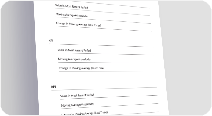ESTABLISH A BASELINE 16 POSITION VELOCITY ACCELERATION KPI Value in Most Recent Period Moving Average (4 periods) Change In Moving Average (Last Three) KPI Value in Most Recent Period Moving Average (4 periods) Change In Moving Average (Last Three) KPI Value in Most Recent Period Moving Average (4 periods) Change In Moving Average (Last Three) Ibbaka’s Pricing Planning Guide & Checklist for 2024 November 2023