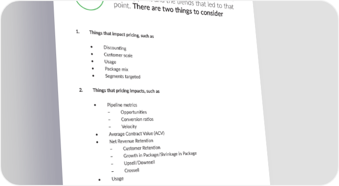 ESTABLISH A BASELINE 14 E昀昀ec琀椀ve planning requires that we know the star琀椀ng point and the trends that led to that point. There are two things to consider 1. Things that impact pricing, such as • Discoun琀椀ng • Customer scale • Usage • Package mix • Segments targeted 2. Things that pricing impacts, such as • Pipeline metrics – Opportuni琀椀es – Conversion ra琀椀os – Velocity • Average Contract Value (ACV) • Net Revenue Reten琀椀on – Customer Reten琀椀on – Growth in Package/Shrinkage in Package – Upsell/Downsell – Crossell • Usage Ibbaka’s Pricing Planning Guide & Checklist for 2024 November 2023
