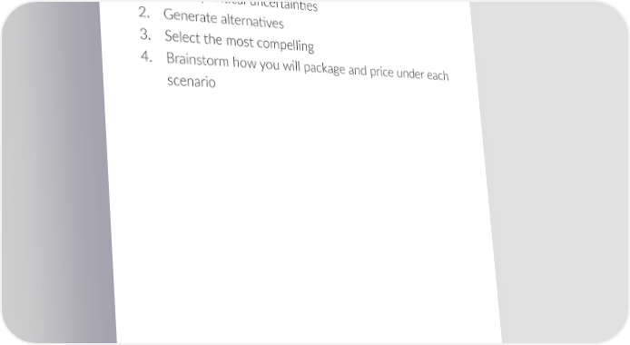 29 1. Iden琀椀fy cri琀椀cal uncertain琀椀es 2. Generate alterna琀椀ves 3. Select the most compelling 4. Brainstorm how you will package and price under each scenario Ibbaka’s Pricing Planning Guide & Checklist for 2024 November 2023