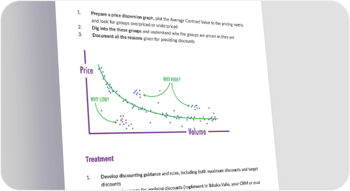 PRICING ACTIONS TO CONSIDER 21 CONTROL DISCOUNTING Diagnosis 1. Prepare a price dispersion graph, plot the Average Contract Value to the pricing metric and look for groups overpriced or underpriced 2. Dig into the these groups and understand why the groups are priced as they are 3. Document all the reasons given for providing discounts Price WHY HIGH? WHY LOW? Volume Treatment 1. Develop discoun琀椀ng guidance and rules, including both maximum discounts and target discounts 2. Document reasons for applying discounts (implement in Ibbaka Valio, your CRM or your CPQ) 3. Support sales with tools and training to help them use value rather than discounts as a way to close deals Ibbaka’s Pricing Planning Guide & Checklist for 2024 November 2023