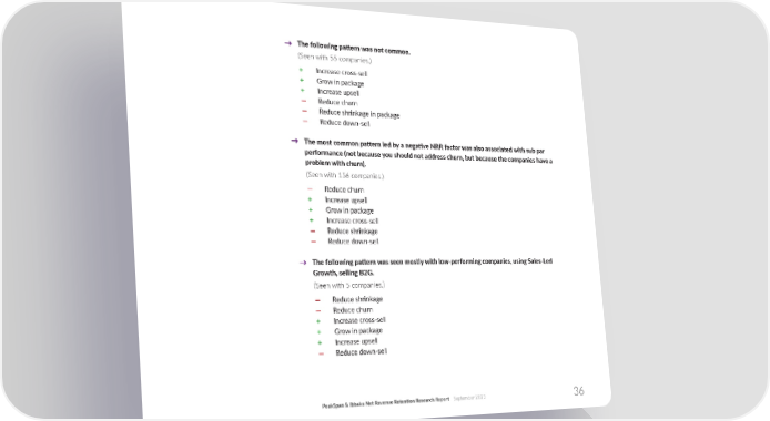 The following pa琀琀ern was not common. → (Seen with 55 companies.) + Increase cross-sell + Grow in package + Increase upsell — Reduce churn — Reduce shrinkage in package — Reduce down-sell → The most common pa琀琀ern led by a nega琀椀ve NRR factor was also associated with sub par performance (not because you should not address churn, but because the companies have a problem with churn). (Seen with 156 companies.) — Reduce churn + Increase upsell + Grow in package + Increase cross-sell — Reduce shrinkage — Reduce down-sell The following pa琀琀ern was seen mostly with low-performing companies, using Sales-Led → Growth, selling B2G. (Seen with 5 companies.) — Reduce shrinkage — Reduce churn + Increase cross-sell + Grow in package + Increase upsell — Reduce down-sell PeakSpan & Ibbaka Net Revenue Reten琀椀on Research Report September 2023 36