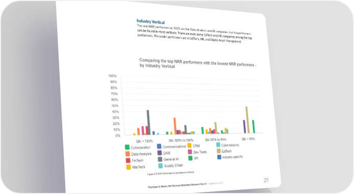 Industry Ver琀椀cal The star NRR performers in 2023 are the Data Analysis and AI companies, but top performers can be found in most ver琀椀cals. There are even some EdTech and HR companies among the top performers. The under performers are in EdTech, HR, and Digital Asset Management. Comparing the top NRR performers with the lowest NRR performers - by Industry Vertical Figure 23: NRR Performance by Industry Ver琀椀cal PeakSpan & Ibbaka Net Revenue Reten琀椀on Research Report September 2023 29