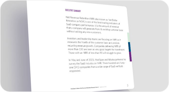 EXECUTIVE SUMMARY Net Revenue Reten琀椀on (NRR also known as Net Dollar Reten琀椀on or NDR) is one of the best leading indicators of SaaS company performance. It is the amount of revenue that a company will generate from its exis琀椀ng customer base without adding any new customers. Investors and leadership teams are focusing on NRR as it measures the health of the customer base and predicts recurring revenue growth. Companies delivering NRR of more than 130 are seen as very good targets for investment. Those with an NRR of less than 90 will struggle to grow. In May and June of 2023, PeakSpan and Ibbaka partnered to survey the SaaS industry on NRR. Three hundred and forty- one (341) companies from a wide range of SaaS ver琀椀cals responded. PeakSpan & Ibbaka Net Revenue Reten琀椀on Research Report September 2023 3