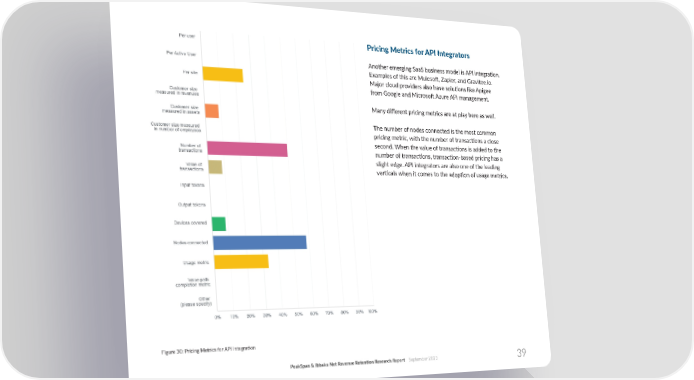 Pricing Metrics for API Integrators Another emerging SaaS business model is API integra琀椀on. Examples of this are Muleso昀琀, Zapier, and Gravitee.io. Major cloud providers also have solu琀椀ons like Apigee from Google and Microso昀琀 Azure API management. Many di昀昀erent pricing metrics are at play here as well. The number of nodes connected is the most common pricing metric, with the number of transac琀椀ons a close second. When the value of transac琀椀ons is added to the number of transac琀椀ons, transac琀椀on-based pricing has a slight edge. API integrators are also one of the leading ver琀椀cals when it comes to the adop琀椀on of usage metrics. Figure 30: Pricing Metrics for API Integra琀椀on PeakSpan & Ibbaka Net Revenue Reten琀椀on Research Report September 2023 39