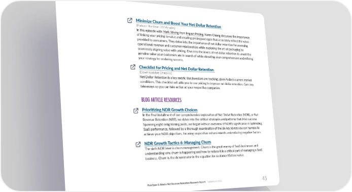 Minimize Churn and Boost Your Net Dollar Reten琀椀on (Podcast Run琀椀me: 33 Minutes) In this episode with Mark S琀椀ving from Impact Pricing, Karen Chiang discusses the importance of linking your pricing to value and crea琀椀ng pricing packages that accurately re昀氀ect the value provided to consumers. They delve into the importance of net dollar reten琀椀on for assessing opera琀椀onal revenue and customer rela琀椀onships while exploring the art of packaging by seamlessly aligning value with pricing. Dive into the levers of net dollar reten琀椀on to unveil the genuine value your customers are in search of while eleva琀椀ng your comprehension and re昀椀ning your strategy for enduring success. Checklist for Pricing and Net Dollar Reten琀椀on (Downloadable Checklist) Net Dollar Reten琀椀on is a key metric that investors are tracking, given today’s current market condi琀椀ons. This checklist will able you to use pricing to improve net dollar reten琀椀on. Gain key takeaways so you can take ac琀椀on at your respec琀椀ve companies. BLOG ARTICLE RESOURCES Priori琀椀zing NDR Growth Choices In the 昀椀nal installment of our comprehensive explora琀椀on of Net Dollar Reten琀椀on (NDR), or Net Revenue Reten琀椀on (NRR), we delve into the cri琀椀cal strategies and pa琀琀erns that drive success. Spanning eight enlightening posts, we began with an overview of NDR’s signi昀椀cance in op琀椀mizing SaaS performance, followed by a thorough examina琀椀on of the six key levers you can harness to achieve your NDR objec琀椀ves, focusing on posi琀椀ve enhancements and reducing nega琀椀ve factors. NDR Growth Tac琀椀cs 6: Managing Churn The sixth NDR lever is churn management. Churn is the great enemy of SaaS businesses and understanding why churn is happening and how to reduce it is a cri琀椀cal part of managing a SaaS business. Churn is the denominator in the equa琀椀on for customer life琀椀me value. PeakSpan & Ibbaka Net Revenue Reten琀椀on Research Report September 2023 45