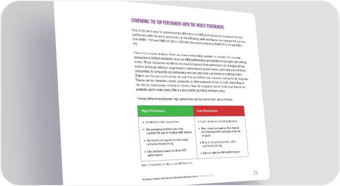 COMPARING THE TOP PERFORMERS WITH THE WORST PERFORMERS One of the best ways to understand the di昀昀erences in NRR performance is to compare the best performers with the worst performers. In the following table and 昀椀gures we compare the top two 琀椀ers (NRR > 130 and NRR of 120 to 129) with the worst performers (NRR 90 to 94 and NRR < 90). This is not a causal analysis. There are many confounding variables to consider. For example, companies in EdTech tended to have low NRR performance and tended to use a per-user pricing metric. These companies would not necessarily improve their performance by changing pricing metrics (although adding a usage-based or performance-based metric could help some of these companies). AI companies are performing very well and o昀琀en use tokens as a pricing metric (Tokens are the basic units of text or code that an LLM AI uses to process and generate language. Tokens can be characters, words, subwords, or other segments of text or code, depending on the chosen tokeniza琀椀on method or scheme.) Non-AI companies do not really have this metric available and in many cases, this is a poor metric as it does not track value. The key di昀昀erences between high performers and low performers are as follows. Table 6: Characteris琀椀cs of High vs. Low NRR Performers PeakSpan & Ibbaka Net Revenue Reten琀椀on Research Report September 2023 26