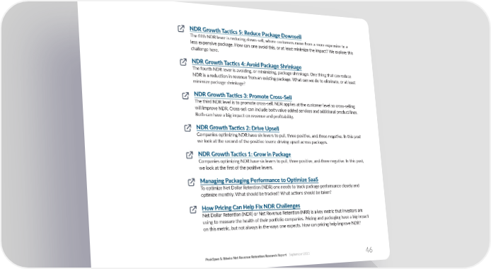 NDR Growth Tac琀椀cs 5: Reduce Package Downsell The 昀椀昀琀h NDR lever is reducing down-sell, where customers move from a more expensive to a less expensive package. How can one avoid this, or at least minimize the impact? We explore this challenge here. NDR Growth Tac琀椀cs 4: Avoid Package Shrinkage The fourth NDR lever is avoiding, or minimizing, package shrinkage. One thing that can reduce NDR is a reduc琀椀on in revenue from an exis琀椀ng package. What can we do to eliminate, or at least minimize package shrinkage? NDR Growth Tac琀椀cs 3: Promote Cross-Sell The third NDR level is to promote cross-sell. NDR applies at the customer level so cross-selling will improve NDR. Cross-sell can include both value-added services and addi琀椀onal product lines. Both can have a big impact on revenue and pro昀椀tability. NDR Growth Tac琀椀cs 2: Drive Upsell Companies op琀椀mizing NDR have six levers to pull, three posi琀椀ve, and three nega琀椀ve. In this post we look at the second of the posi琀椀ve levers: driving upsell across packages. NDR Growth Tac琀椀cs 1: Grow in Package Companies op琀椀mizing NDR have six levers to pull, three posi琀椀ve, and three nega琀椀ve. In this post, we look at the 昀椀rst of the posi琀椀ve levers. Managing Packaging Performance to Op琀椀mize SaaS To op琀椀mize Net Dollar Reten琀椀on (NDR) one needs to track package performance closely and op琀椀mize monthly. What should be tracked? What ac琀椀ons should be taken? How Pricing Can Help Fix NDR Challenges Net Dollar Reten琀椀on (NDR) or Net Revenue Reten琀椀on (NRR) is a key metric that investors are using to measure the health of their por琀昀olio companies. Pricing and packaging have a big impact on this metric, but not always in the ways one expects. How can pricing help improve NDR? PeakSpan & Ibbaka Net Revenue Reten琀椀on Research Report September 2023 46