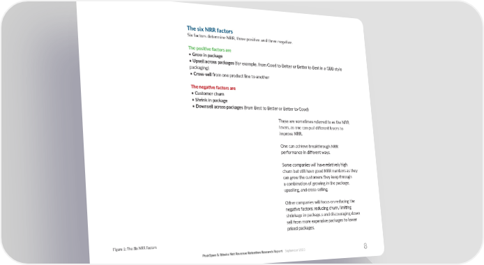 The six NRR factors Six factors determine NRR, three posi琀椀ve and three nega琀椀ve. The posi琀椀ve factors are •Grow in package •Upsell across packages (for example, from Good to Be琀琀er or Be琀琀er to Best in a GBB style packaging) •Cross-sell from one product line to another The nega琀椀ve factors are •Customer churn •Shrink in package •Downsell across packages (from Best to Be琀琀er or Be琀琀er to Good) These are some琀椀mes referred to as the NRR levers, as one can pull di昀昀erent levers to improve NRR. One can achieve breakthrough NRR performance in di昀昀erent ways. Some companies will have rela琀椀vely high churn but s琀椀ll have good NRR numbers as they can grow the customers they keep through a combina琀椀on of growing in the package, upselling, and cross-selling. Other companies will focus on reducing the nega琀椀ve factors: reducing churn, limi琀椀ng shrinkage in package,s and discouraging down sell from more expensive packages to lower priced packages. Figure 1: The Six NRR Factors PeakSpan & Ibbaka Net Revenue Reten琀椀on Research Report September 2023 8