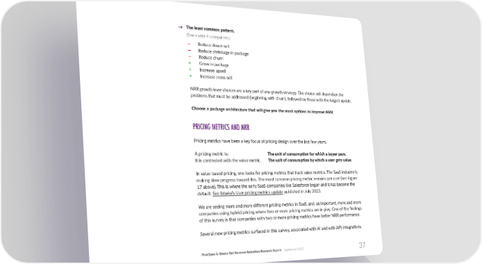 The least common pa琀琀ern. → (Seen with 4 companies.) — Reduce down-sell — Reduce shrinkage in package — Reduce churn + Grow in package + Increase upsell + Increase cross-sell NRR growth lever choices are a key part of any growth strategy. The choice will depend on the problems that must be addressed (beginning with churn), followed by those with the largest upside. Choose a package architecture that will give you the most op琀椀ons to improve NRR. PRICING METRICS AND NRR Pricing metrics have been a key focus of pricing design over the last few years. A pricing metric is: The unit of consump琀椀on for which a buyer pays. It is contrasted with the value metric. The unit of consump琀椀on by which a user gets value. In value-based pricing, one looks for pricing metrics that track value metrics. The SaaS industry is making slow progress toward this. The most common pricing metric remains per user (see Figure 17 above). This is where the early SaaS companies like Salesforce began and it has become the default. See Ibbaka’s User pricing metrics update published in July 2023. We are seeing more and more di昀昀erent pricing metrics in SaaS, and, as important, more and more companies using hybrid pricing where two or more pricing metrics are in play. One of the 昀椀ndings of this survey is that companies with two or more pricing metrics have be琀琀er NRR performance. Several new pricing metrics surfaced in this survey, associated with AI and with API integra琀椀ons. PeakSpan & Ibbaka Net Revenue Reten琀椀on Research Report September 2023 37