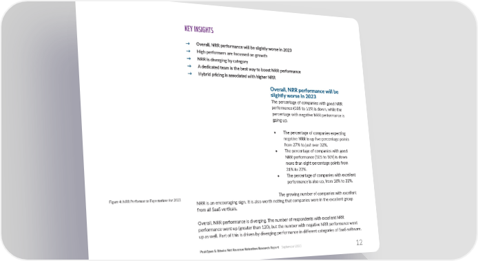 KEY INSIGHTS → Overall, NRR performance will be slightly worse in 2023 → High performers are focussed on growth → NRR is diverging by category → A dedicated team is the best way to boost NRR performance → Hybrid pricing is associated with higher NRR Overall, NRR performance will be slightly worse in 2023 The percentage of companies with good NRR performance (105 to 119) is down, while the percentage with nega琀椀ve NRR performance is going up. • The percentage of companies expec琀椀ng nega琀椀ve NRR is up 昀椀ve percentage points from 27% to just over 32%. • The percentage of companies with good NRR performance (105 to 109) is down more than eight percentage points from 31% to 22%. • The percentage of companies with excellent performance is also up, from 18% to 22%. The growing number of companies with excellent Figure 4: NRR Performance Expecta琀椀ons for 2023 NRR is an encouraging sign. It is also worth no琀椀ng that companies were in the excellent group from all SaaS ver琀椀cals. Overall, NRR performance is diverging. The number of respondents with excellent NRR performance went up (greater than 120), but the number with nega琀椀ve NRR performance went up as well. Part of this is driven by diverging performance in di昀昀erent categories of SaaS so昀琀ware. PeakSpan & Ibbaka Net Revenue Reten琀椀on Research Report September 2023 12