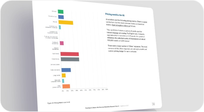 Pricing metrics for AI AI solu琀椀ons use the following pricing metrics. There is a great variety here, but the most common metrics are based on tokens. Open.ai explains tokens as follows: “You can think of tokens as pieces of words used for natural language processing. For English text, 1 token is approximately 4 characters or 0.75 words. As a point of reference, the collected works of Shakespeare are about 900,000 words or 1.2M tokens.” There were a large number of ‘Other’ responses. The most common of the other responses are pricing by model and custom pricing design for each customer. Figure 29: Pricing Metrics used in AI PeakSpan & Ibbaka Net Revenue Reten琀椀on Research Report September 2023 38
