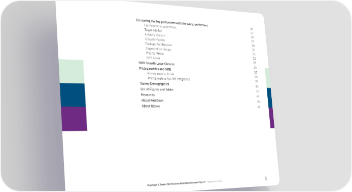 Comparing the top performers with the worst performers 26 Con昀椀dence in projec琀椀ons 27 Target Market 28 Industry Ver琀椀cal 29 Growth Mo琀椀on 30 Package Architecture 31 Organiza琀椀on Design 32 Pricing Metric 33 NRR Lever 34 NRR Growth Lever Choices 35 Pricing metrics and NRR 37 Pricing metrics for AI 38 Pricing metrics for API Integrators 39 Survey Demographics 40 List of Figures and Tables 43 Resources 44 About PeakSpan 48 About Ibbaka 48 PeakSpan & Ibbaka Net Revenue Reten琀椀on Research Report September 2023 6