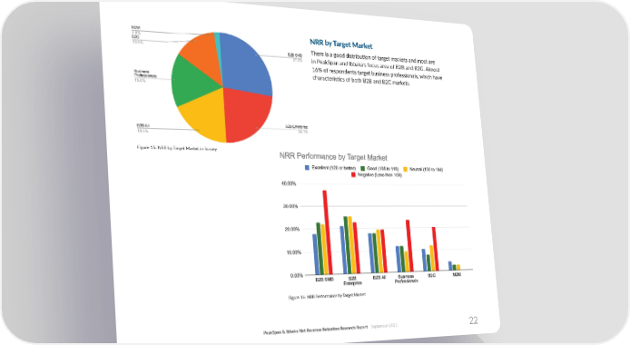 NRR by Target Market There is a good distribu琀椀on of target markets and most are in PeakSpan and Ibbaka’s focus area of B2B and B2G. Almost 16% of respondents target business professionals, which have characteris琀椀cs of both B2B and B2C markets. Figure 15: NRR by Target Market in Survey Figure 16: NRR Performance by Target Market PeakSpan & Ibbaka Net Revenue Reten琀椀on Research Report September 2023 22