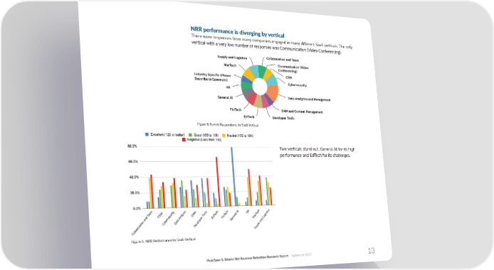 NRR performance is diverging by ver琀椀cal There were responses from many companies engaged in many di昀昀erent SaaS ver琀椀cals. The only ver琀椀cal with a very low number of responses was Communica琀椀on (Video Conferencing). Figure 5: Survey Respondents by SaaS Ver琀椀cal Two ver琀椀cals stand out. General AI for its high performance and EdTech for its challenges. Figure 6: NRR Performance by SaaS Ver琀椀cal PeakSpan & Ibbaka Net Revenue Reten琀椀on Research Report September 2023 13