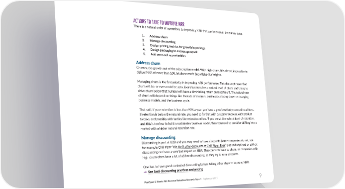 ACTIONS TO TAKE TO IMPROVE NRR There is a natural order of opera琀椀ons to improving NRR that can be seen in the survey data. 1. Address churn 2. Manage discoun琀椀ng 3. Design pricing metrics for growth in package 4. Design packaging to encourage upsell 5. Add cross sell opportuni琀椀es Address churn Churn sucks growth out of the subscrip琀椀on model. With high churn, it is almost impossible to deliver NRR of more than 100, let alone reach Snow昀氀ake-like heights. Managing churn is the 昀椀rst priority in improving NRR performance. This does not mean that churn will be, or even could be zero. Every business has a natural level of churn and trying to drive churn below that number will have a diminishing return on investment. The natural rate of churn will depend on things like the rate of mergers, businesses closing down or changing business models, and the business cycle. That said, if your reten琀椀on is less than 90% a year, you have a problem that you need to address. If reten琀椀on is below the natural rate, you need to 昀椀x that with customer success, with product tweaks, and possibly with tac琀椀cs like reten琀椀on o昀昀ers. If you are at the natural level of reten琀椀on, and this is too low to build a sustainable business model, then you need to consider shi昀琀ing into a market with a higher natural reten琀椀on rate. Manage discoun琀椀ng Discoun琀椀ng is part of B2B and you may need to have discounts (some companies do not, see for example Chili Piper ‘We don’t o昀昀er discounts at Chili Piper. Ever’. But undisciplined or ad-hoc discoun琀椀ng can have a very bad impact on NRR. This connects back to churn, as companies with high churn o昀琀en have a lot of ad hoc discoun琀椀ng, as they try to save accounts. One has to have good control of discoun琀椀ng before taking other steps to improve NRR. →See SaaS discoun琀椀ng prac琀椀ces and pricing PeakSpan & Ibbaka Net Revenue Reten琀椀on Research Report September 2023 9