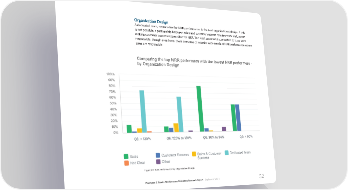 Organiza琀椀on Design A dedicated team, responsible for NRR performance, is the best organiza琀椀onal design. If this is not possible, a partnership between sales and customer success can also work well, as can making customer success responsible for NRR. The least successful approach is to have sales responsible, though even here, there are some companies with excellent NRR performance where sales are responsible. Comparing the top NRR performers with the lowest NRR performers - by Organization Design Figure 26: NRR Performance by Organiza琀椀on Design PeakSpan & Ibbaka Net Revenue Reten琀椀on Research Report September 2023 32