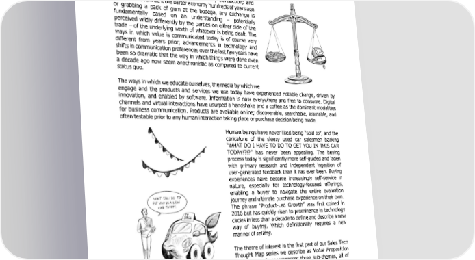 Part One: Value Proposition Articulation “If the message is relevant, then it concerns them. If the message is important, then it concerns them deeply. If the message is urgent, then it concerns them deeply, now.” ~ Flint McGlaughlin The concept of value is foundational to any transaction; and always has been. Be it the barter economy hundreds of years ago or grabbing a pack of gum at the bodega, any exchange is fundamentally based on an understanding – potentially perceived wildly differently by the parties on either side of the trade – of the underlying worth of whatever is being dealt. The ways in which value is communicated today is of course very different from years prior; advancements in technology and shifts in communication preferences over the last few years have been so dramatic that the way in which things were done even a decade ago now seem anachronistic as compared to current status quo. The ways in which we educate ourselves, the media by which we engage and the products and services we use today have experienced notable change, driven by innovation, and enabled by software. Information is now everywhere and free to consume. Digital channels and virtual interactions have usurped a handshake and a coffee as the dominant modalities for business communication. Products are available online; discoverable, searchable, learnable, and often testable prior to any human interaction taking place or purchase decision being made. Human beings have never liked being “sold to”, and the caricature of the sleezy used car salesmen barking “WHAT DO I HAVE TO DO TO GET YOU IN THIS CAR TODAY!?!?” has never been appealing. The buying process today is significantly more self-guided and laden with primary research and independent ingestion of user-generated feedback than it has ever been. Buying experiences have become increasingly self-service in nature, especially for technology-focused offerings, enabling a buyer to navigate the entire evaluation journey and ultimate purchase experience on their own. The phrase “Product-Led Growth” was first coined in 2016 but has quickly risen to prominence in technology circles in less than a decade to define and describe a new way of buying. Which definitionally requires a new manner of selling. The theme of interest in the first part of our Sales Tech Thought Map series we describe as Value Proposition Articulation. It encompasses three sub-themes, all of which touch on an element of enabling the aforementioned new paradigm shift in the world of selling. We’ve observed a number of exciting vendors and new categories emerging over the last few years, but will touch on a few discrete competencies we believe are strategic and sustainably valuable in this editorial – namely startups attacking the challenges and opportunities associated with i) Supporting efficient, effective and personalized engagement at scale; ii) Enabling and driving the new “product- - 2 -