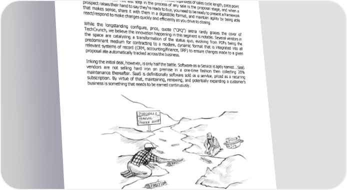 to develop their higher-level skills versus wading through hours and hours of conversational data in the hopes of extracting pertinent actionable insights is incredibly strategic and will be for years to come. Adaptive CPQ & Renewals Automation Friction is the enemy of execution in any sales process, regardless of sales cycle length, price point or industry vertical. The last step in the process of any sale is the proposal stage, and when a prospect raises their hand to say they’re ready to buy, you need to be ready to present a framework that makes sense, share it with them in a digestible format, and maintain agility by being able react/respond to make changes quickly and efficiently as you drive to closing. While the longstanding configure, price, quote (“CPQ”) arena rarely graces the cover of TechCrunch, we believe the innovation happening in this segment is notable. Several vendors in the space are catalyzing a transformation of the status quo, evolving from PDFs being the predominant medium for contracting to a modern, dynamic format that is integrated into all relevant systems of record (CRM, accounting/finance, ERP) to ensure changes made to a given proposal ate automatically tracked across the business. Inking the initial deal, however, is only half the battle. Software-as-a-Service is aptly named… SaaS vendors are not selling hard iron on premise in a one-time fashion then collecting 20% maintenance thereafter. SaaS is definitionally software sold as a service, priced as a recurring subscription. By virtue of that, maintaining, renewing, and potentially expanding a customer’s business is something that needs to be earned continuously. - 21 -