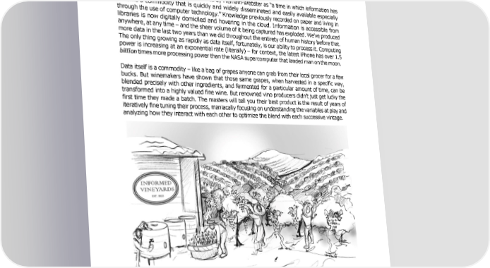 Part Two: Data-Informed Decision Making “I keep saying that the sexy job in the next 10 years will be statisticians, and I’m not kidding.” – Hal Varian, Chief Economist, Google We live in the Information Age, defined by Merriam-Webster as “a time in which information has become a commodity that is quickly and widely disseminated and easily available especially through the use of computer technology.” Knowledge previously recorded on paper and living in libraries is now digitally domiciled and hovering in the cloud. Information is accessible from anywhere, at any time – and the sheer volume of it being captured has exploded. We’ve produced more data in the last two years than we did throughout the entirety of human history before that. The only thing growing as rapidly as data itself, fortunately, is our ability to process it. Computing power is increasing at an exponential rate (literally) – for context, the latest iPhone has over 1.5 billion times more processing power than the NASA supercomputer that landed man on the moon. Data itself is a commodity – like a bag of grapes anyone can grab from their local grocer for a few bucks. But winemakers have shown that those same grapes, when harvested in a specific way, blended precisely with other ingredients, and fermented for a particular amount of time, can be transformed into a highly valued fine wine. But renowned vino producers didn’t just get lucky the first time they made a batch. The masters will tell you their best product is the result of years of iteratively fine tuning their process, maniacally focusing on understanding the variables at play and analyzing how they interact with each other to optimize the blend with each successive vintage. Analogizing grapes to data might be a bit of a stretch, but hopefully the premise is clear. Leveraging data to make strategic decisions is important… no shit, Sherlock! But the reality is we are still in the early innings of the information revolution, and while more organizations are beginning to weave data-informed decisioning into the fabric of company culture, transforming behavior and ushering - 7 -