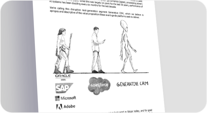 And yet, despite the magnitude of change the category has undergone since the company stepped onto the field, the pace of innovation we are witnessing now is so significant that we believe it has the potential to nurture category evolution in the next 20 years that is even more dramatic. Over the last 10 years, AI has outperformed Moore’s Law – the longest standing assertion related to pace of technology innovation which suggests that computer performance (speed, processing power) will double every two years. While this was largely on point for the last 50 years, performance of AI systems has been doubling every six months for the last decade. We’re calling this disruptive next-generation segment Generative CRM, which we believe is apropos and descriptive of the value proposition these avant-garde platforms seek to deliver. Generative AI has rapidly become the most pervasive buzz word in Silicon Valley, and for good reason, as it pushes technology beyond observation, analysis, and insight, to creation for the first time. Early applications of Generative AI are primarily focused primarily on creating data and content in the form of bespoke text, vibrant imagery, dynamic audio/video, and even software code itself. Generative CRM vendors are similarly focused on creation, but instead of data, these businesses are creating revenue opportunities. - 18 -