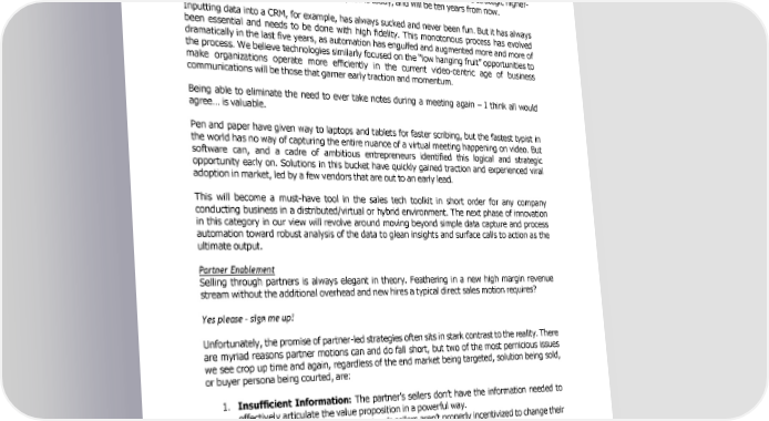 whereby the first things to change tend to be driven by automation of tactical but impactful tasks that were previously largely manual. Driving workflow efficiency or increasing speed of execution provides a benefit that is clear and tangible, easy to define and hard to deny. This is essential for new approaches and technology platforms to gain traction initially and experience widespread adoption thereafter. Technology that frees up employees’ time to focus on more strategic higher- level activities was attractive ten years ago, still is today, and will be ten years from now. Inputting data into a CRM, for example, has always sucked and never been fun. But it has always been essential and needs to be done with high fidelity. This monotonous process has evolved dramatically in the last five years, as automation has engulfed and augmented more and more of the process. We believe technologies similarly focused on the “low hanging fruit” opportunities to make organizations operate more efficiently in the current video-centric age of business communications will be those that garner early traction and momentum. Being able to eliminate the need to ever take notes during a meeting again – I think all would agree… is valuable. Pen and paper have given way to laptops and tablets for faster scribing, but the fastest typist in the world has no way of capturing the entire nuance of a virtual meeting happening on video. But software can, and a cadre of ambitious entrepreneurs identified this logical and strategic opportunity early on. Solutions in this bucket have quickly gained traction and experienced viral adoption in market, led by a few vendors that are out to an early lead. This will become a must-have tool in the sales tech toolkit in short order for any company conducting business in a distributed/virtual or hybrid environment. The next phase of innovation in this category in our view will revolve around moving beyond simple data capture and process automation toward robust analysis of the data to glean insights and surface calls to action as the ultimate output. Partner Enablement Selling through partners is always elegant in theory. Feathering in a new high margin revenue stream without the additional overhead and new hires a typical direct sales motion requires? Yes please – sign me up! Unfortunately, the promise of partner-led strategies often sits in stark contrast to the reality. There are myriad reasons partner motions can and do fall short, but two of the most pernicious issues we see crop up time and again, regardless of the end market being targeted, solution being sold, or buyer persona being courted, are: 1. Insufficient Information: The partner’s sellers don’t have the information needed to effectively articulate the value proposition in a powerful way. 2. Insufficient Incentive: The partner’s sellers aren’t properly incentivized to change their behavior and sell the new solution instead of (or in conjunction with) their own. You can’t expect someone to do something if you don’t tell them how to do it and give them the tools they need to do it successfully. Asking your kid to cut the lawn but not giving them a mower and a crash course on how to use it wouldn’t make sense. And while there may be some kids out there who are psyched to get out there and cut the grass purely for the love of the game… I’ll - 13 -