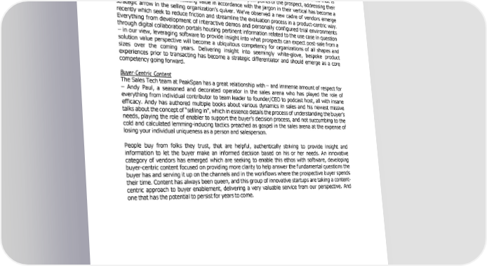 technical inquiries, devising implementation strategy, etc. – has become a more integral part of the GTM motion for many companies in this PLG-oriented era we find ourselves in. Whether an organization offers the ability to trial a product directly or simply wants to show the solution via a demo that will hold water in today’s environment, delivering an experience that is seemingly individualized and configured to the needs and pain points of the prospect, addressing their specific use case while articulating value in accordance with the jargon in their vertical has become a strategic arrow in the selling organization’s quiver. We’ve observed a new cadre of vendors emerge recently which seek to reduce friction and streamline the evaluation process in a product-centric way. Everything from development of interactive demos and personally configured trial environments through digital collaboration portals housing pertinent information related to the use case in question – in our view, leveraging software to provide insight into what prospects can expect post-sale from a solution value perspective will become a ubiquitous competency for organizations of all shapes and sizes over the coming years. Delivering insight into seemingly white-glove, bespoke product experiences prior to transacting has become a strategic differentiator and should emerge as a core competency going forward. Buyer-Centric Content The Sales Tech team at PeakSpan has a great relationship with – and immense amount of respect for – Andy Paul, a seasoned and decorated operator in the sales arena who has played the role of everything from individual contributor to team leader to founder/CEO to podcast host, all with insane efficacy. Andy has authored multiple books about various dynamics in sales and his newest missive talks about the concept of “selling in”, which in essence details the process of understanding the buyer’s needs, playing the role of enabler to support the buyer’s decision process, and not succumbing to the cold and calculated lemming-inducing tactics preached as gospel in the sales arena at the expense of losing your individual uniqueness as a person and salesperson. People buy from folks they trust, that are helpful, authentically striving to provide insight and information to let the buyer make an informed decision based on his or her needs. An innovative category of vendors has emerged which are seeking to enable this ethos with software, developing buyer-centric content focused on providing more clarity to help answer the fundamental questions the buyer has and serving it up on the channels and in the workflows where the prospective buyer spends their time. Content has always been queen, and this group of innovative startups are taking a content- centric approach to buyer enablement, delivering a very valuable service from our perspective. And one that has the potential to persist for years to come. - 5 -