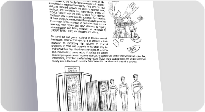 led” sales motion with a focus on the solutions/sales engineering teams and the buyer; and iii) Enhancing the buyer experience by serving up relevant collateral and content, at the right time in the sales process, focused uniquely on the buyer’s needs. Engagement Efficiency / Sales Process Automation Engagement today is defined by email as a central pillar of business communication, flanked by social channel, on-site communication, and mobile-first conversations. Inherently asynchronous in nature the majority of the time, this new dialogue standard supports the ability to leverage tools, methods and workflows that hyper-charge efforts and provide “sellers” with the ability to cast a much wider net and touch a far broader potential audience. By virtue of all of these things, however, many channels and approaches to outreach (initial outreach in particular) have become saturated with “spray and pray” attempts at feigning personalization and failing miserably as manifested by [INSERT NAME HERE] and blasted to the billions. To stand out and garner audience in this new normal, businesses need to find ways to i) be efficient in their approach to contacting high volumes of potential prospects, ii) meet said prospects in the places they live and spend their day, iii) deliver a perception of a one-to- one, individualized conversation, iv) surface and address an acute pain point or need to garner attention, v) address said need or want with relevant a piece data, information, promotion or offer to help reduce friction in the buying process, and vi) drive urgency as to why now is the time to cross the finish line on the marathon that is the path to purchase. - 3 -