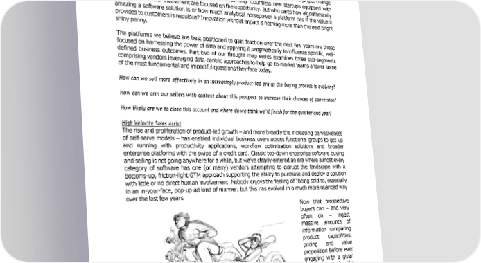 in a shift in mindset takes time. Regardless of how powerful or impactful a solution claims to be, buyer readiness to adopt requires trust. And the most effective way to garner trust is to deliver clear, tangible value. The world isn’t suffering from a lack of insanely smart, overly educated individuals trying to change the world with big data analysis and machine learning. Countless new startups equipped with billions of dollars of investment are focused on the opportunity. But who cares how algorithmically amazing a software solution is or how much analytical horsepower a platform has if the value it provides to customers is nebulous? Innovation without impact is nothing more than the next bright shiny penny. The platforms we believe are best positioned to gain traction over the next few years are those focused on harnessing the power of data and applying it pragmatically to influence specific, well- defined business outcomes. Part two of our thought map series examines three sub-segments comprising vendors leveraging data-centric approaches to help go-to-market teams answer some of the most fundamental and impactful questions they face today. How can we sell more effectively in an increasingly product-led era as the buying process is evolving? How can we arm our sellers with context about this prospect to increase their chances of conversion? How likely are we to close this account and where do we think we’ll finish for the quarter and year? High Velocity Sales Assist The rise and proliferation of product-led growth – and more broadly the increasing pervasiveness of self-serve models – has enabled individual business users across functional groups to get up and running with productivity applications, workflow optimization solutions and broader enterprise platforms with the swipe of a credit card. Classic top-down enterprise software buying and selling is not going anywhere for a while, but we’ve clearly entered an era where almost every category of software has one (or many) vendors attempting to disrupt the landscape with a bottoms-up, friction-light GTM approach supporting the ability to purchase and deploy a solution with little or no direct human involvement. Nobody enjoys the feeling of “being sold to, especially in an in-your-face, pop-up-ad kind of manner, but this has evolved in a much more nuanced way over the last few years. Now that prospective buyers can – and very often do – ingest massive amounts of information comparing product capabilities, pricing and value proposition before ever engaging with a given business directly, the role of the seller in the buying process needs to change. - 8 -