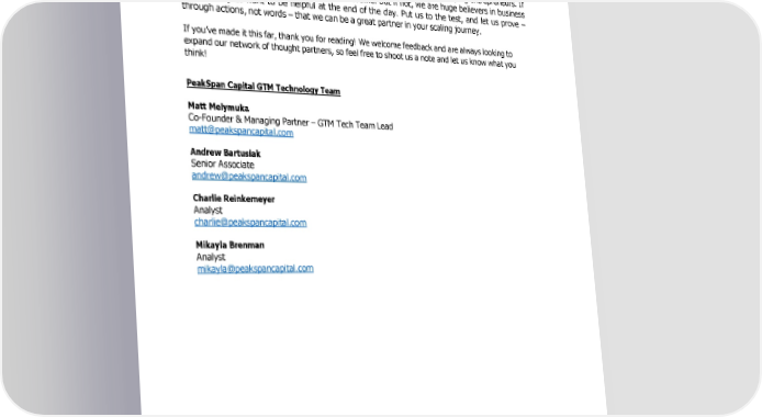 thoughts, reactions, similar resonant quotes or ideas for improvement with regards to this series. And most importantly, we hope you enjoyed it and gleaned something from it! Lastly, and most importantly, reach out if we can be helpful to you. We got into the business of working with growth-stage companies because we are passionate about helping entrepreneurs. If there is a chance to work together, that’s awesome. But if not, we are huge believers in business karma and just want to be helpful at the end of the day. Put us to the test, and let us prove – through actions, not words – that we can be a great partner in your scaling journey. If you’ve made it this far, thank you for reading! We welcome feedback and are always looking to expand our network of thought partners, so feel free to shoot us a note and let us know what you think! PeakSpan Capital GTM Technology Team Matt Melymuka Co-Founder & Managing Partner – GTM Tech Team Lead [email protected] Andrew Bartusiak Senior Associate [email protected] Charlie Reinkemeyer Analyst [email protected] Mikayla Brenman Analyst [email protected] - 28 -